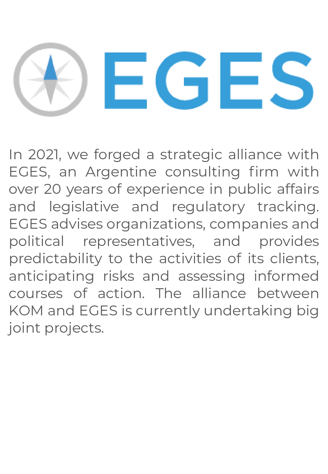 Our experience and knowledge, both in the international and local spheres, are robust, extensive and long-standing, making it possible for us to establish alliances as needed. In addition to this, KOM has a broad network in the public and private sectors across many countries.
