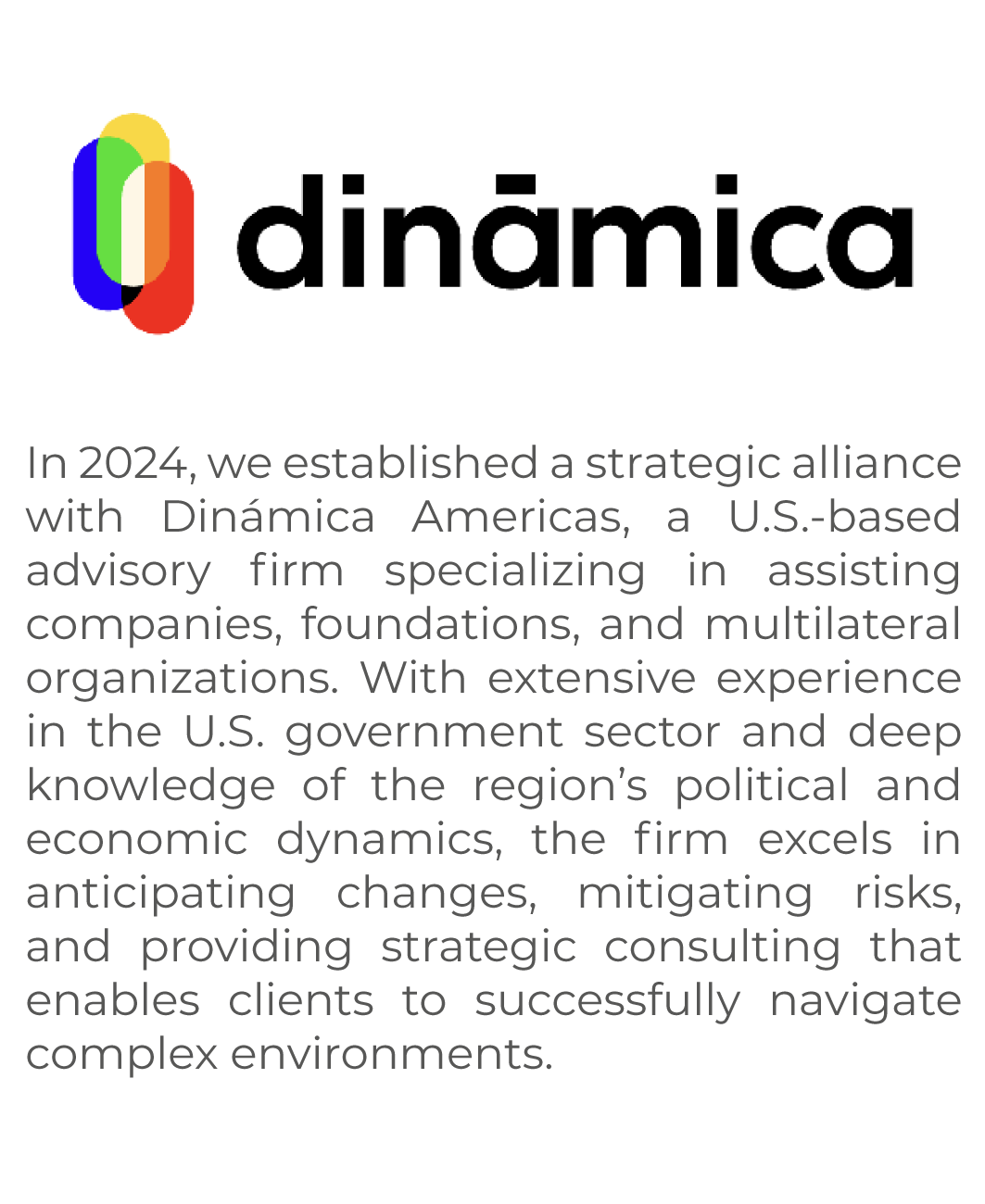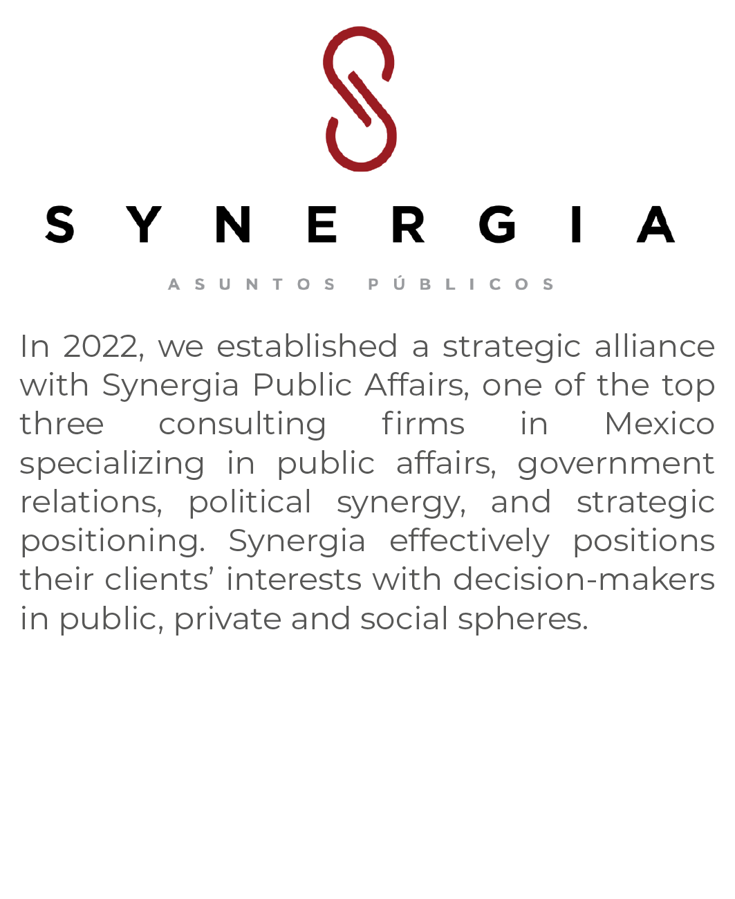 We have skills, experience and close dialogue with strategic interest groups to create meaningful impact and positive influence for our clients. We maintain a positive competitive position in the market due to the extensive experience of our senior partners, the quality of our professional team, guided by high ethical standards. We have associated consultants who are experts in various fields, and we maintain international alliances with Prospectiva, Synergia, Eges and Acento.